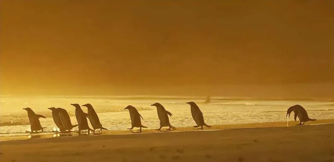7.海边朝阳的企鹅,最后一只掉队了,这是晕船了吗?