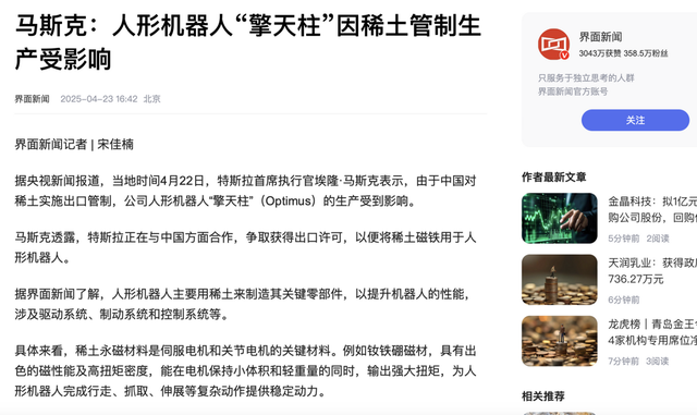 界面新闻2025-04-23《马斯克:人形机器人“擎天柱”因稀土管制生产受影响》