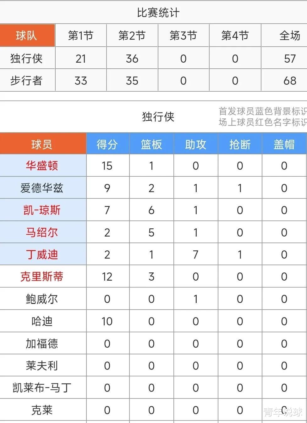 独行侠队首发出场的是丁威迪,马绍尔,华盛顿,凯斯勒·爱德华兹和凯·琼斯。其中,华盛顿拿下26分5篮板,凯·琼斯贡献了18分11篮板,两人成为球队进攻端的支柱。