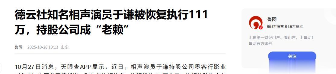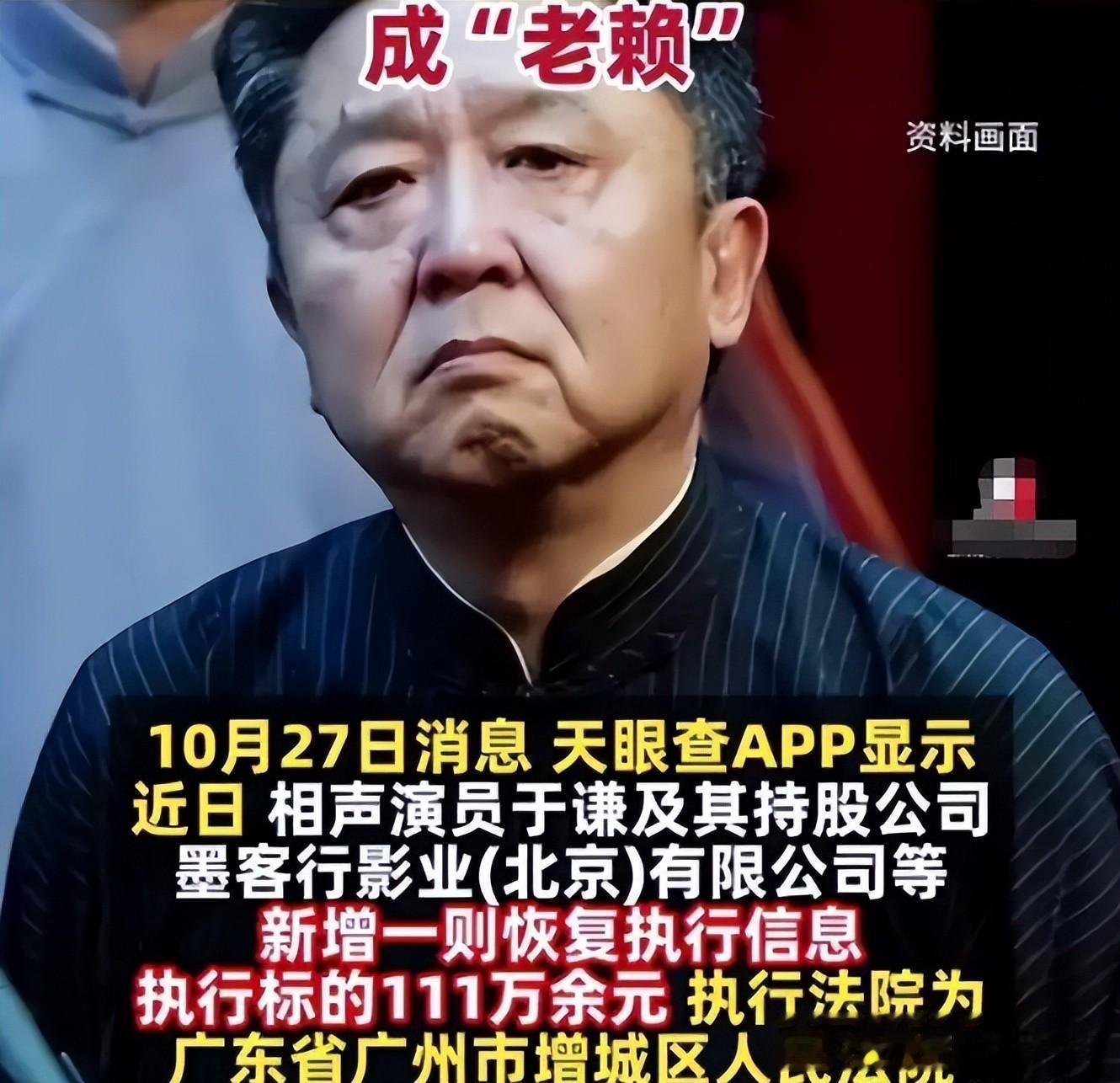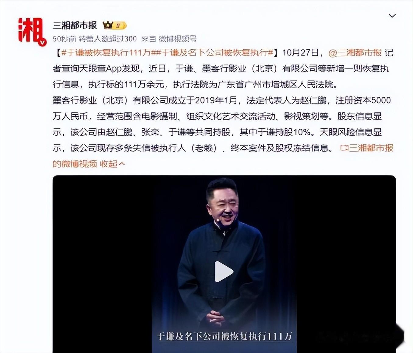 【1】大象新闻 2025-10-27 于谦被恢复执行111万,持股公司成“老赖”