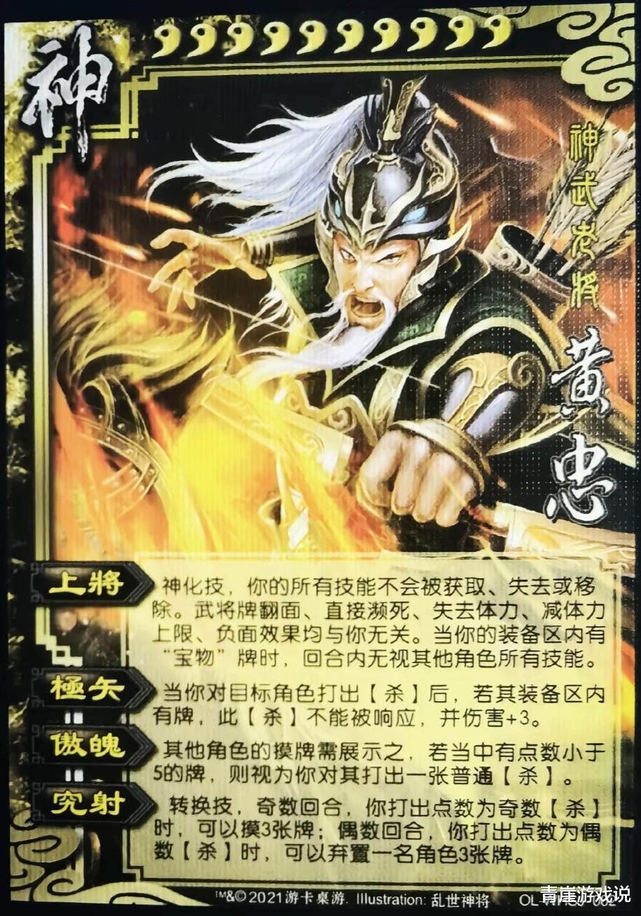 BOSS黄忠【极矢】爆炸加伤,【傲魂】则是多刀,【究射】则是摸牌、拆迁兼备。BOSS黄忠对具有装备牌敌人具有毁灭性的压制力,如果有人敢上装备,等待他的结局就只有被秒杀!
