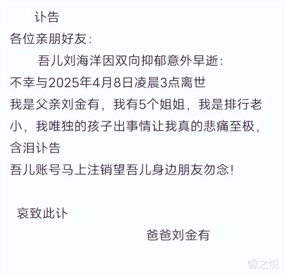 26岁的刘海洋,一个“拆二代”,拥有着令人羡慕的家庭条件,却在凌晨悄然坠楼,离开了人世。他的父亲,在短视频平台上发布了沉痛的讣告,字里行间透露着无法掩饰的悲伤与不解。 这突如其来的噩耗,不仅让一个家庭支离破碎,更让千万网友陷入沉思:是什么,夺走了这个年轻人的生命?