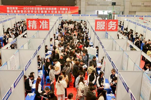 4月20日,职引未来——2025年全国城市巡回招聘(吉林站)暨吉林省医药类毕业生春季大型就业洽谈会在长春中医药大学体育馆举行。本次洽谈活动特色鲜明,是专门为我省医药类毕业生和生物医药健康行业高质量搭建的人才供需精准对接平台。招聘会现场气氛热烈,体育馆内人头攒动。毕业生们手持简历穿梭于各个招聘展位之间,目光专注地浏览展板上的岗位信息,与招聘人员积极交流。