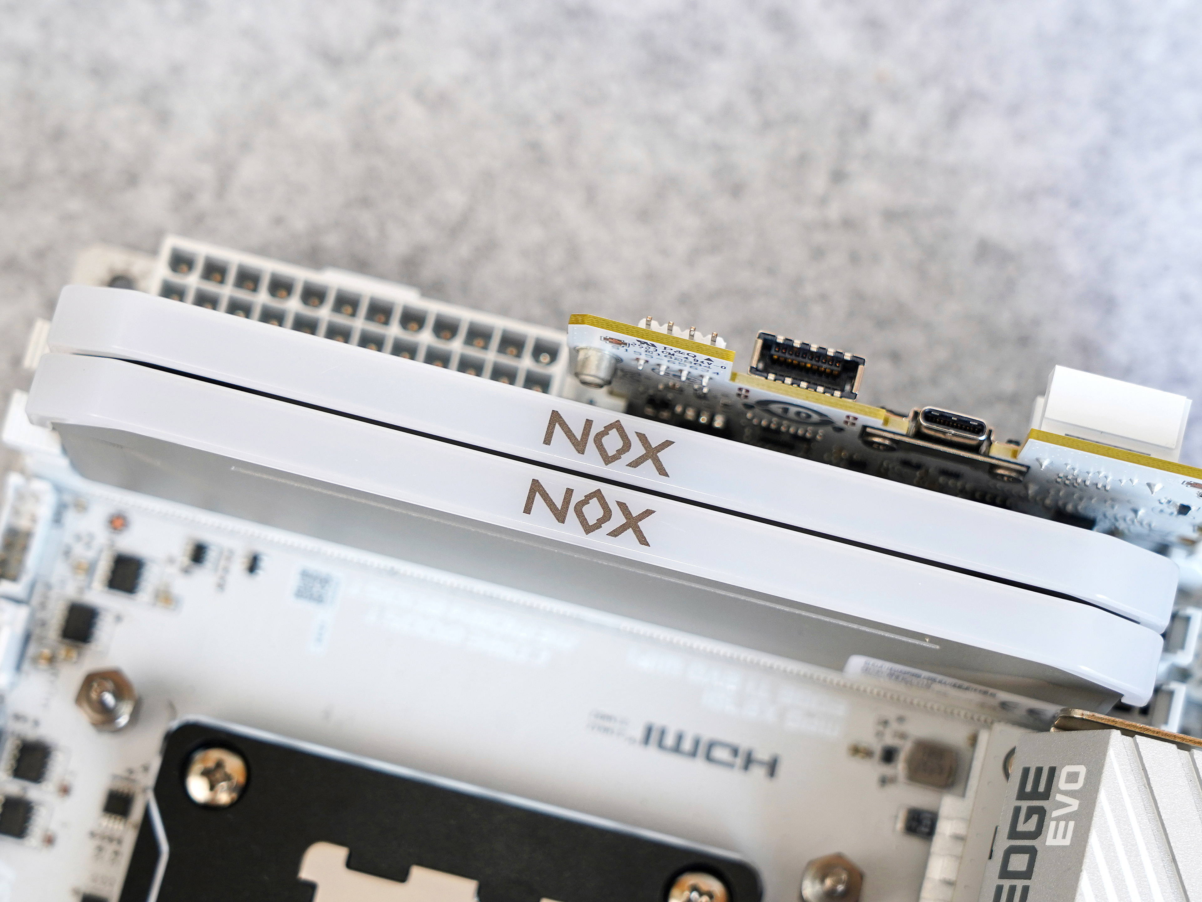 ▼内存顶部为大面积的白色导光条,中间位置有NOX标识,点亮后具有广角漫射灯效,并支持各大板厂ARGB灯控。此外不到44mm的高度,能兼容大部分双塔风冷散热器。