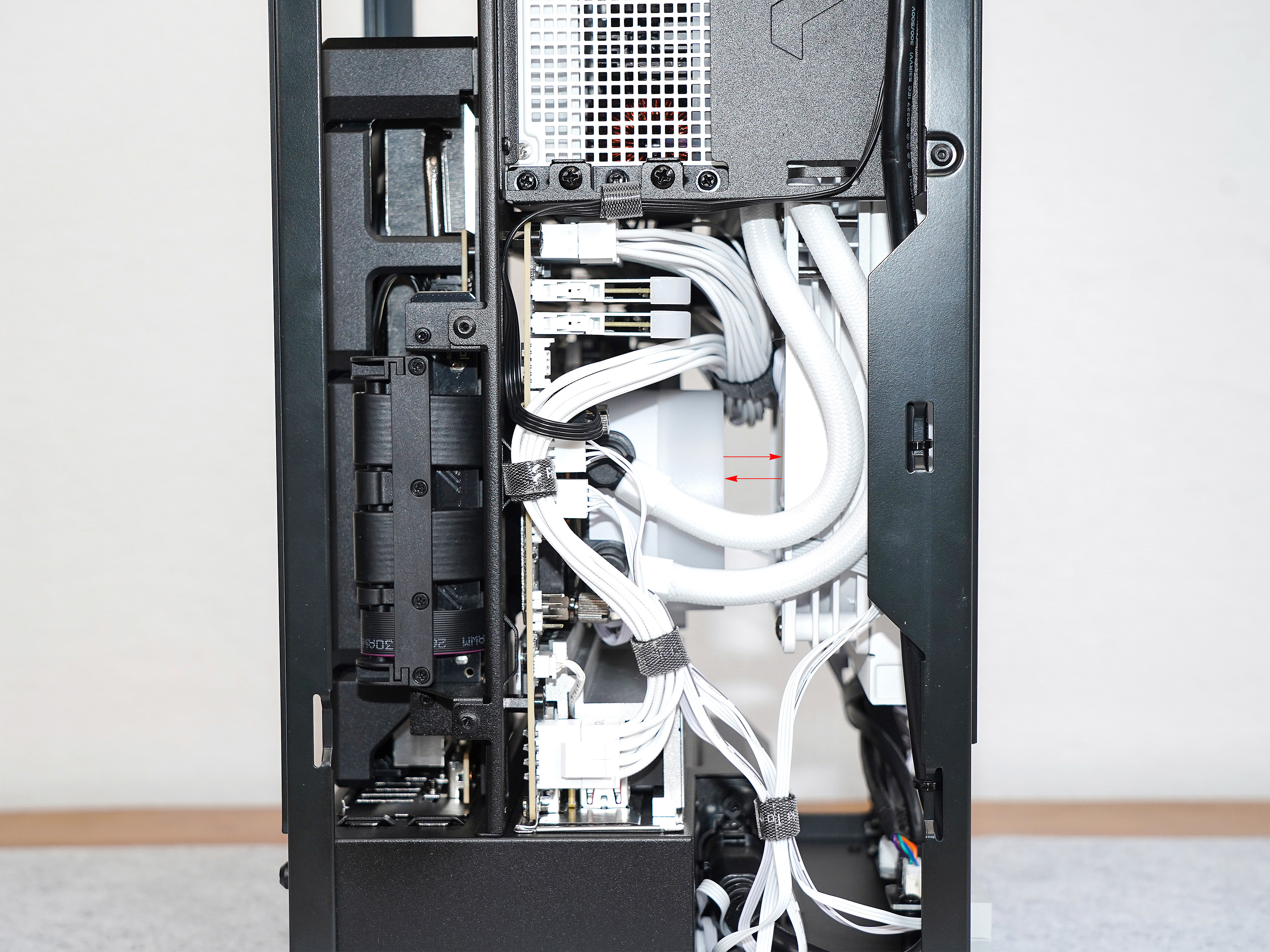 ▼电源的安装也是有点纠结的,电源出风面在主板一侧,可能导致进气不足(冷排风扇排风);或者进气为热风(冷排风扇吸风)。出门在显卡一侧,也会吸入不少显卡排出的热风。