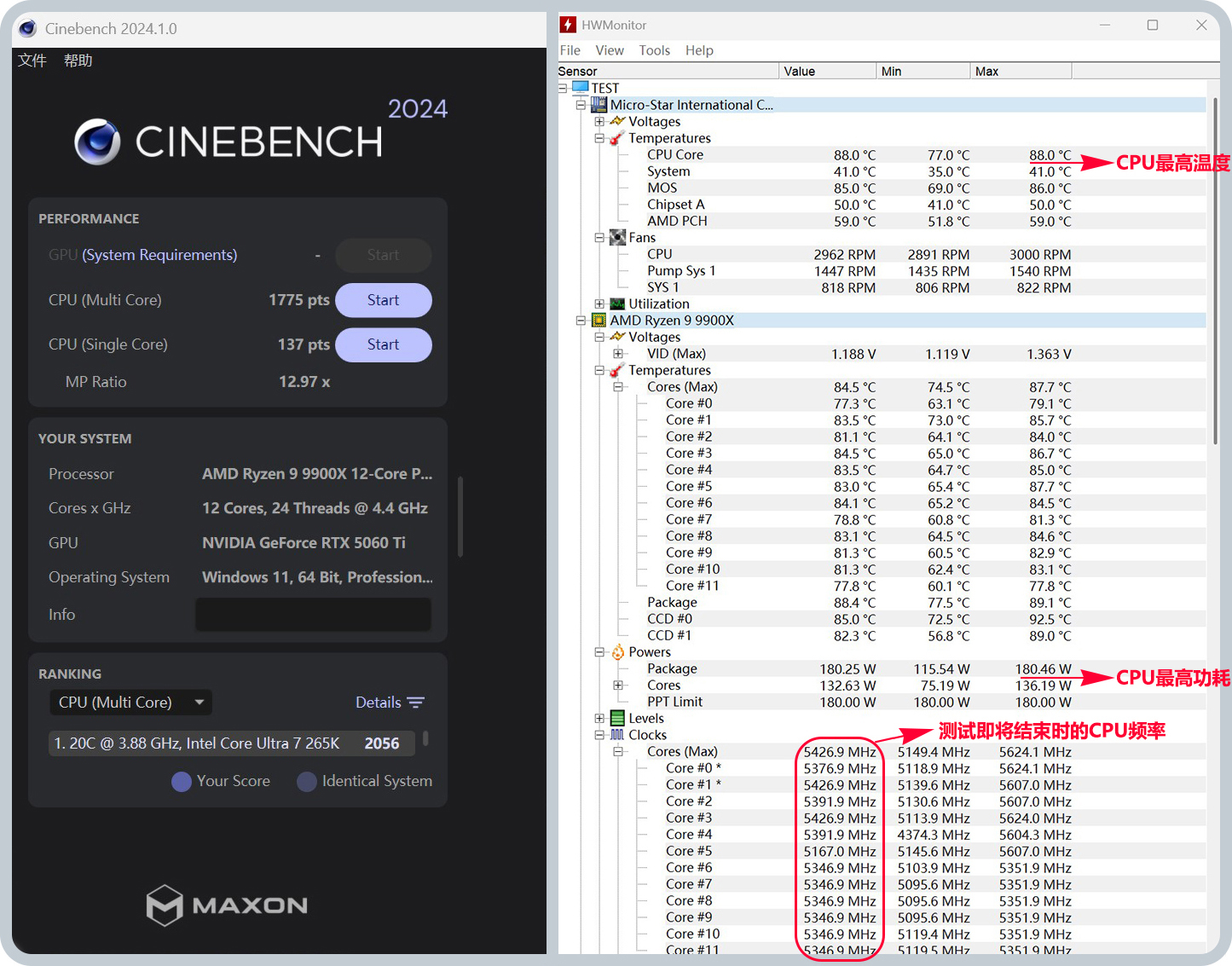 ▼CineBench R24测试中CPU最高温度为88°C,和第2种风道保持一致,但与主板相关的温度确实比前2种风道都高了一些。