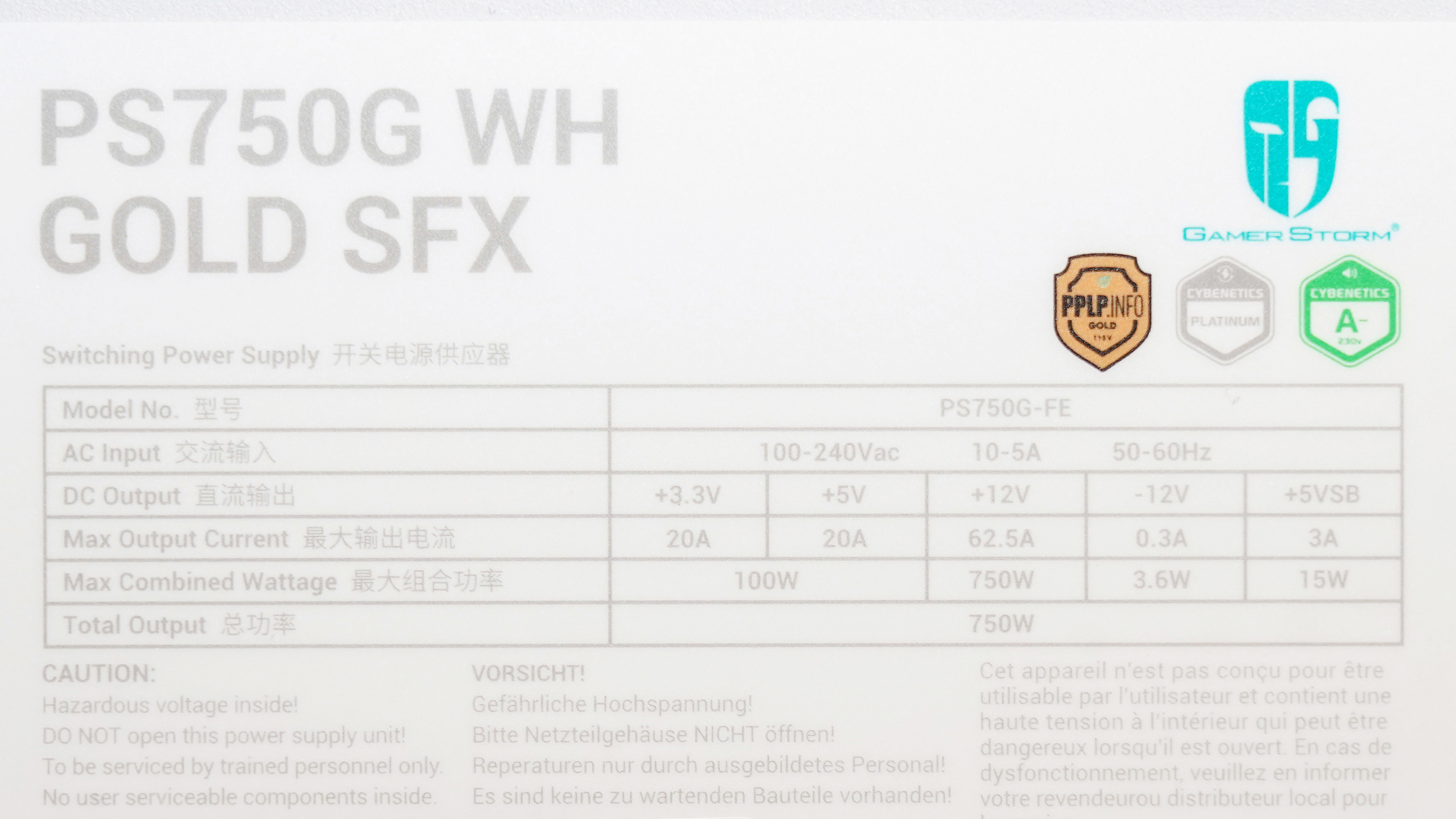 ▼PSG系列电源符合ATX 3.1规范。有 PPLP 和 CYBENETICS 的双金牌认证,以及CYBENETICS的A-静音评级。电源铭牌上标识为单路12V输出设计,12V输出最高为62.5A=750W,达到电源的额定功率。5V、3.3V输出20A,两路联合输出最高为100W。此外还支持UVP、OVP、OTP、SCP、OPP、OCP、NLO以及SIP八项保护功能。