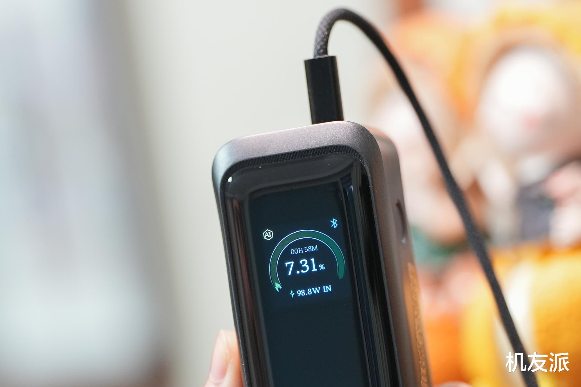 聊完外观,接下来我们开始实际体验。首先我们进行输入测试,ANKER如意棒充电宝屏幕显示98.8W的输入功率,与官方100W输入吻合。给充电宝充满真的很快,只要半个多小时。