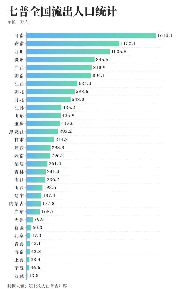七普数据显示,河南户籍人口外流规模高达1610万,相当于每6个河南人就有1人背井离乡,是全国人口流失最严重的省份。