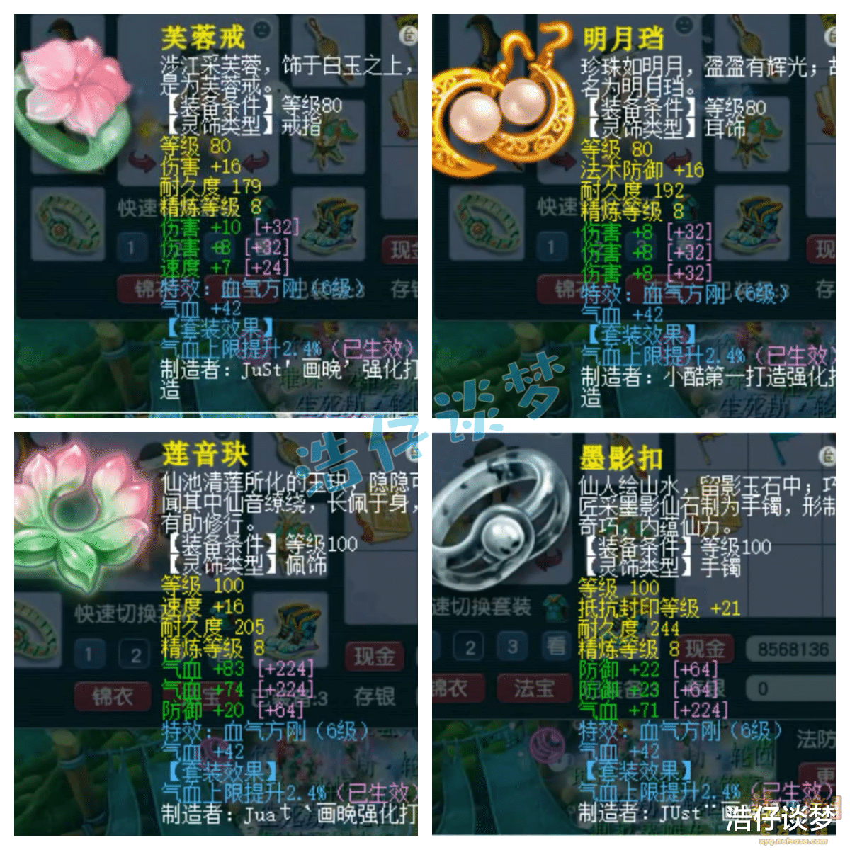 戒指下排双伤害一速度,耳饰下排三伤害,配饰下排双气血一防御,手镯下排双防御一气血,全部打了8锻星辉石,特效都是6级血气方刚。