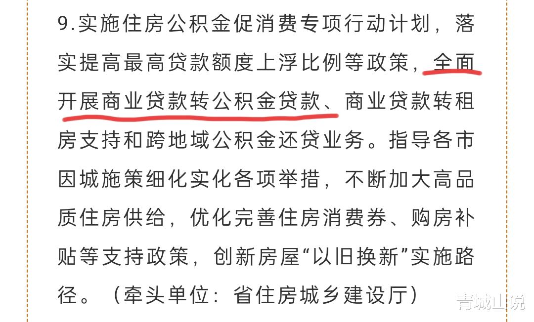 通知提到:实施住房公积金促消费专项行动计划,落实提高最高贷款额度上浮比例等政策,全面开展商业贷款转公积金贷款、商业贷款转租房支持和跨地域公积金还贷业务。