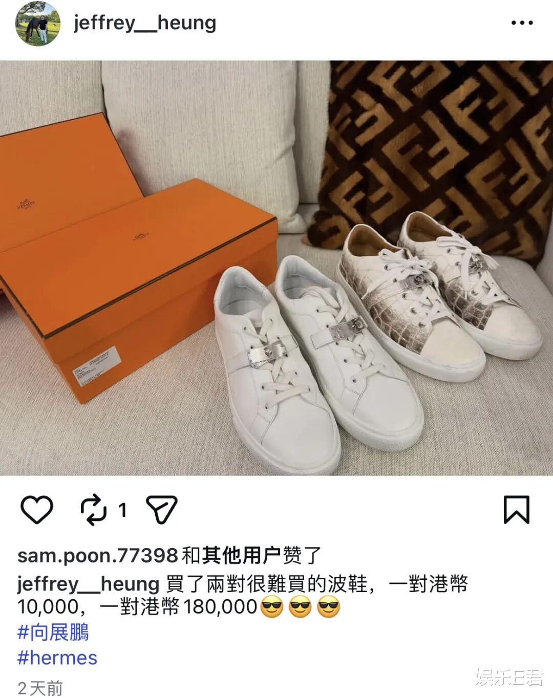 向展鹏晒出爱马仕极难入手的VIP限量款,并亲自写下的霸气配文:“当你已经拥有一双港币1万元的运动鞋,你就会学我追求多一双港币18万元的运动鞋。”
