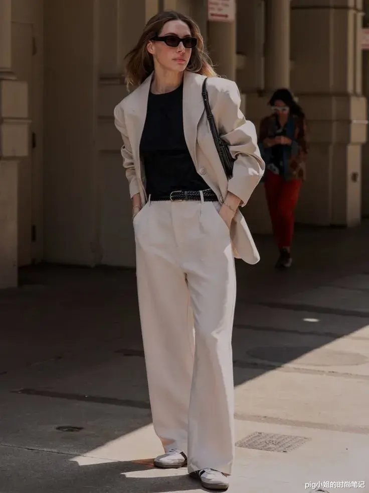 混搭配饰是白裤子活力的点睛笔!一双运动鞋与黑白通勤装的组合,轻松地为造型续上了随性自由的活力气场。