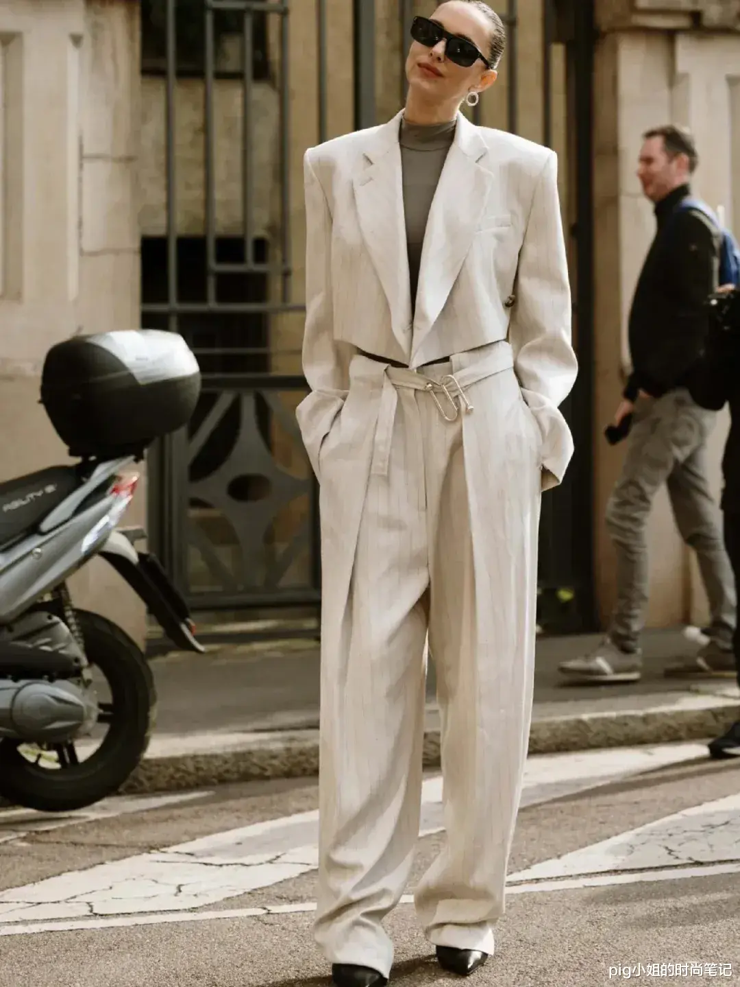 用带有流行元素的上衣来搭配白裤,通过褶皱、撞色等等细节让基础款也能穿出别致的时髦感。
