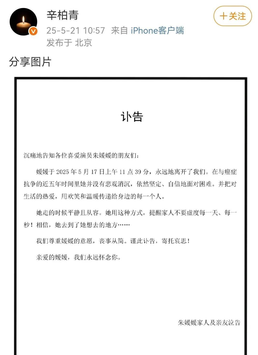 2025年5月21日晚上8点,辛柏青的微博突然炸出一颗“催泪弹”。 这位拿过话剧界最高奖的男演员,用颤抖的账号发出一张黑白讣告:“爱妻朱媛媛因病医治无效,于今日永别。 ”
