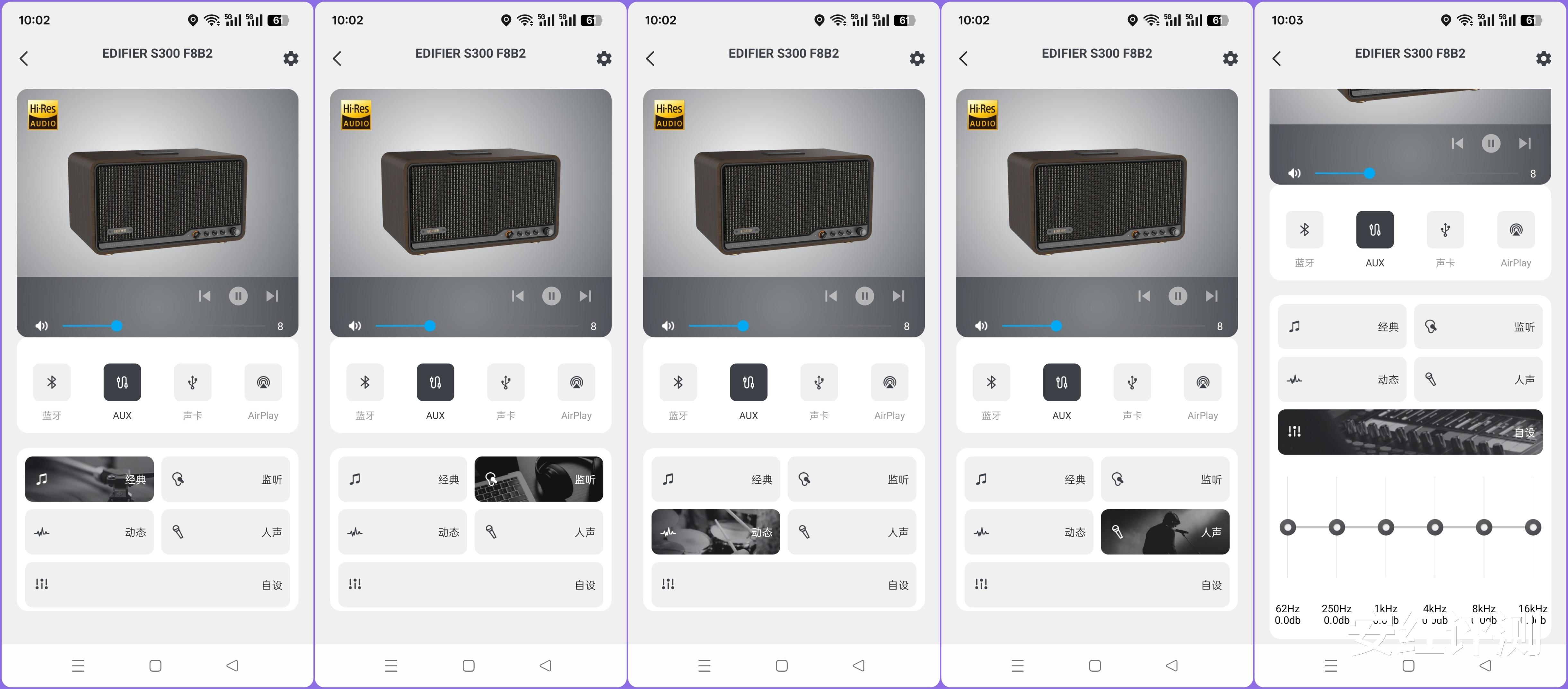 此款音箱除了支持遥控,还有专属的Edifier Home App,可进行蓝牙、AUX、USB声卡和AirPlay四种输入音源切换,还可以进行经典、监听、动态和人声四种音乐风格切换,并支持自设EQ调节,按照自己的使用喜好,享受专属定制的音乐体验。