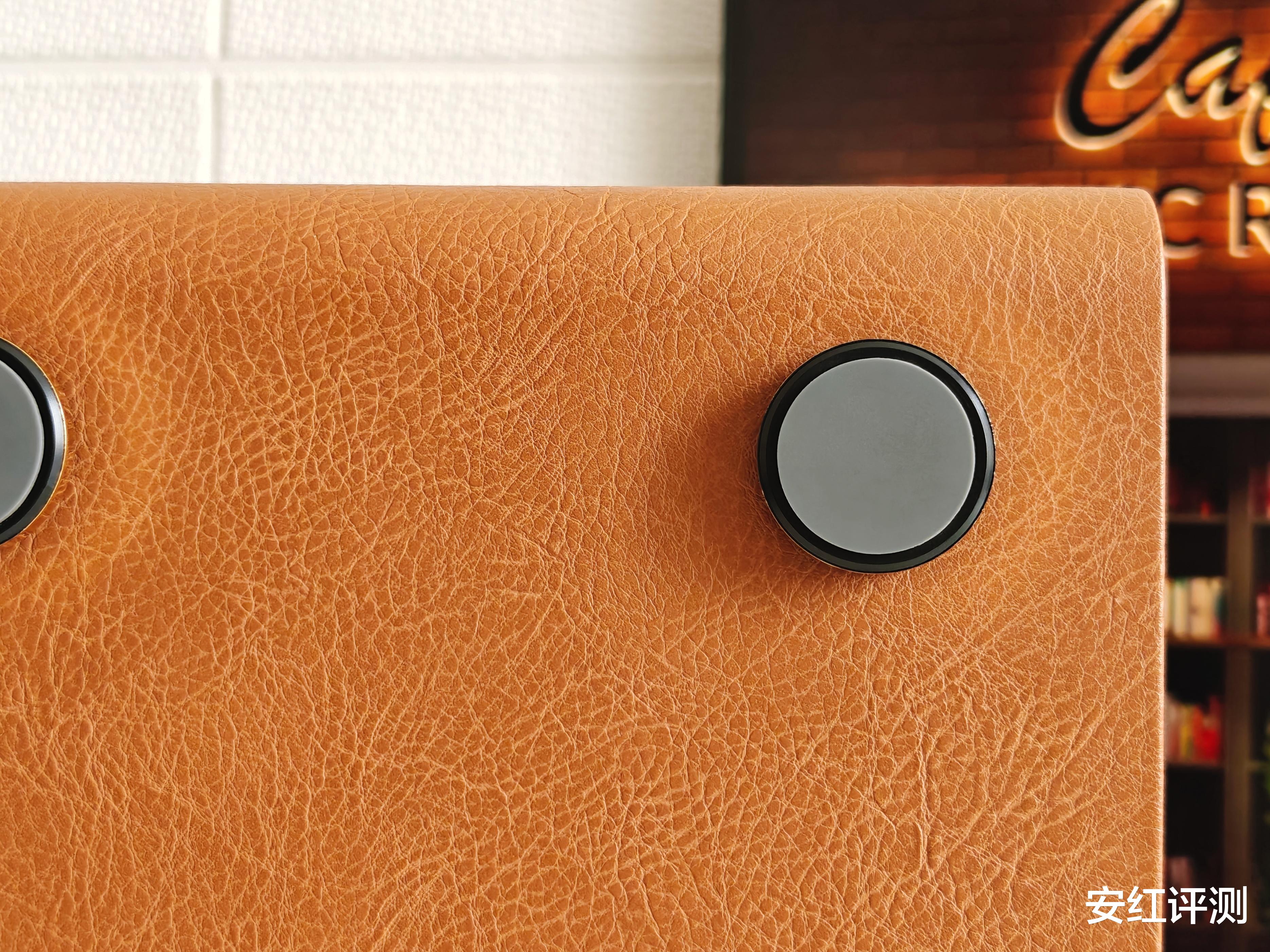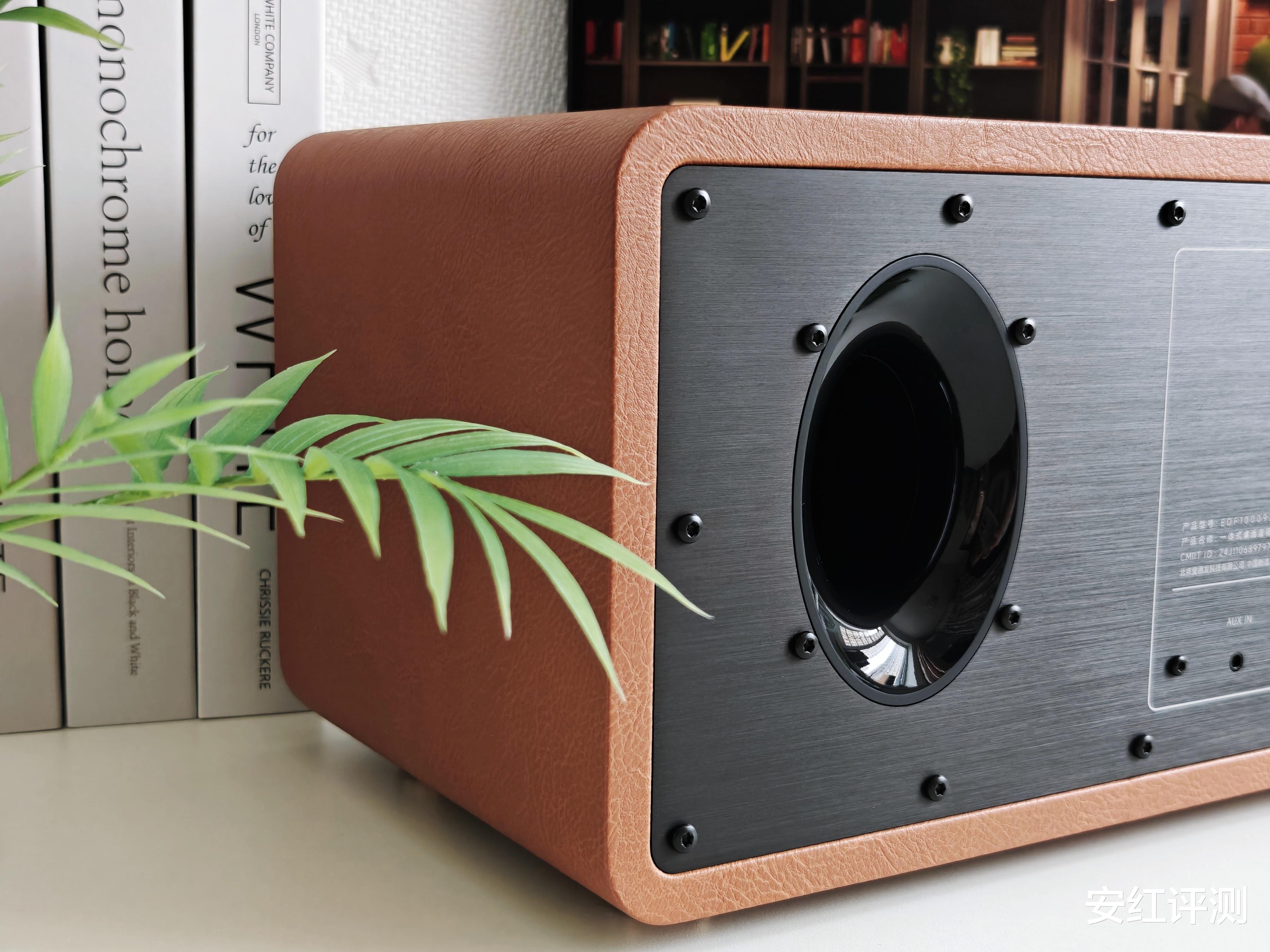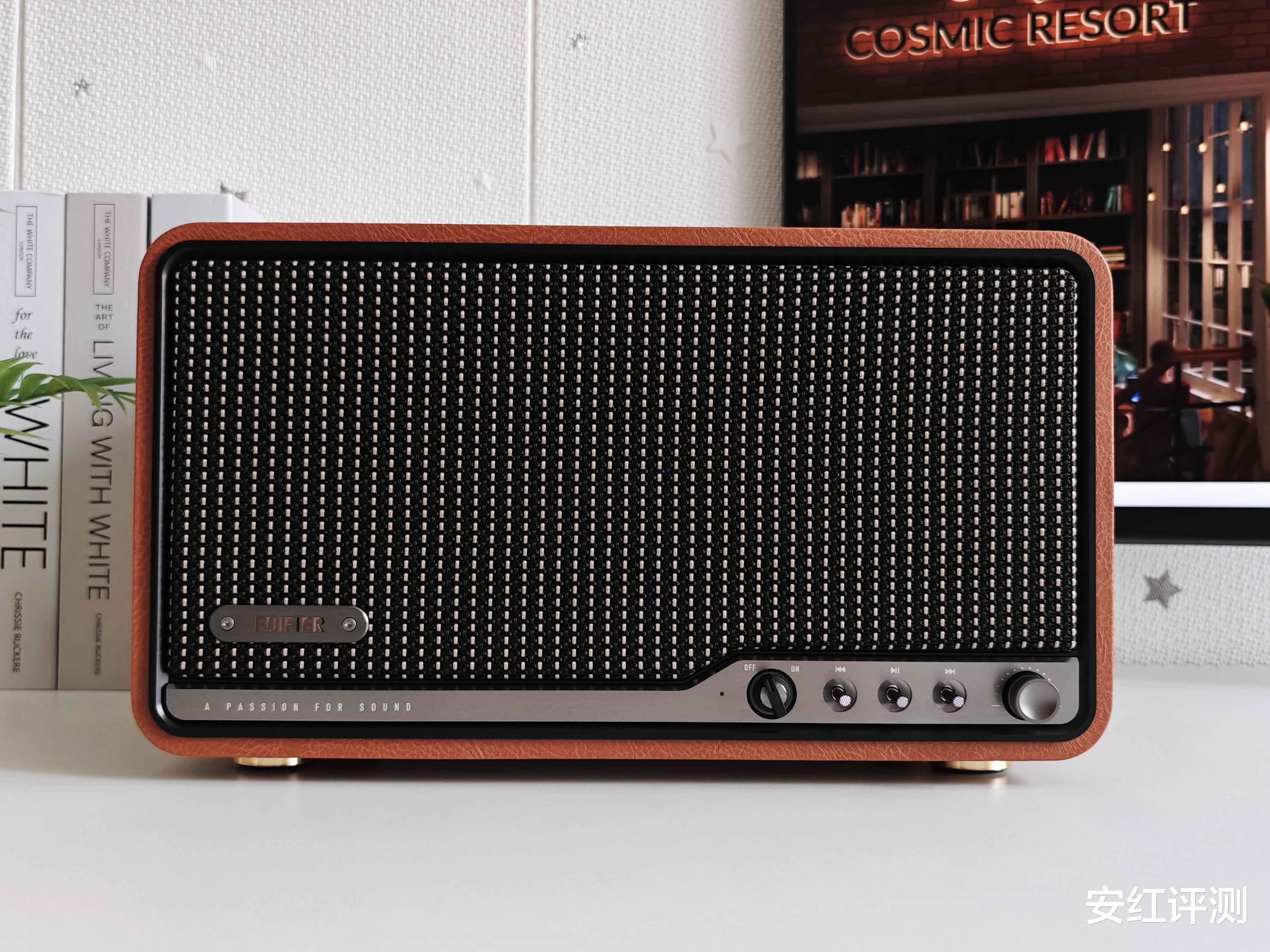 此款音箱有黑胡桃、暖棕咖和贝母白三种配色可选,黑胡桃沉稳尊贵,暖棕咖温馨惬意,贝母白优雅迷人。虽然每种配色都很NICE,但我更喜欢暖棕咖。音箱外形尺寸为350×229X203mm,比我之前使用的漫步者M330大上一圈,可以装进更大的发声单元。它采用MDF木质箱体外壳,外覆皮革纹理更显轻奢;双色编织网布,富有复古风情,同时具有高透声率,还能够防止灰尘等侵蚀音箱内部元件;铝质操控面板,表面经CNC工艺处理,辅以金属旋钮与拨杆,质感非凡。如此高级的复古设计尽显典雅,散发至臻气质,完美融入各种家居风格。