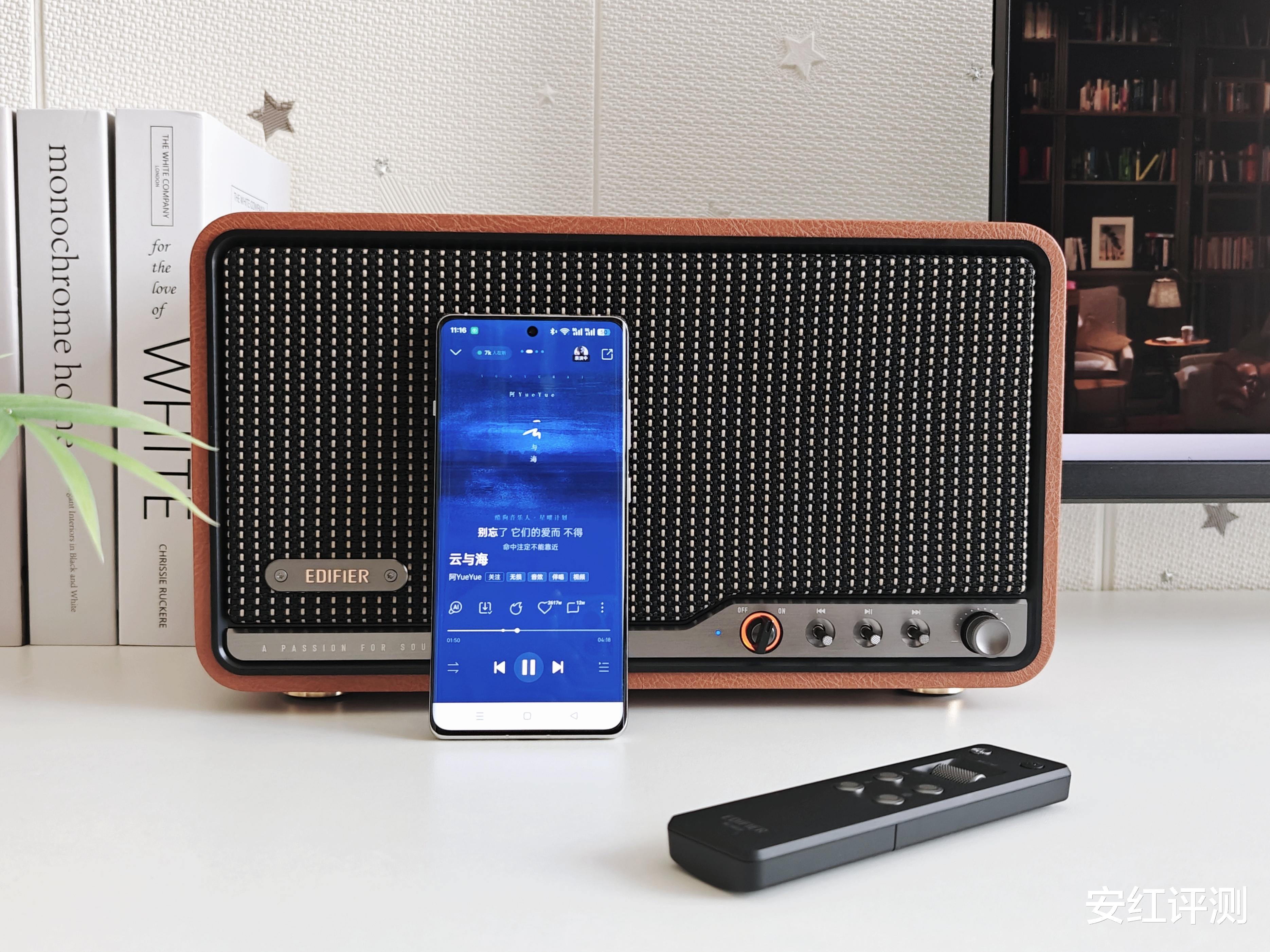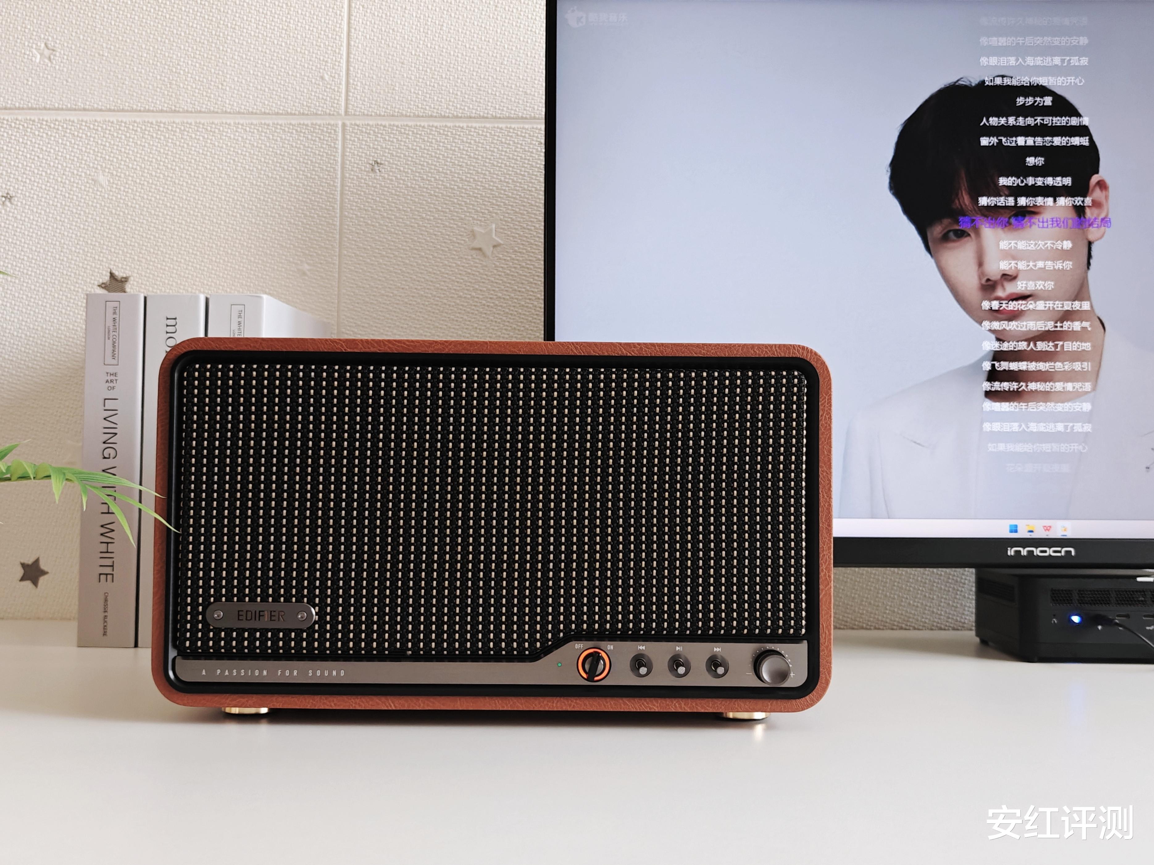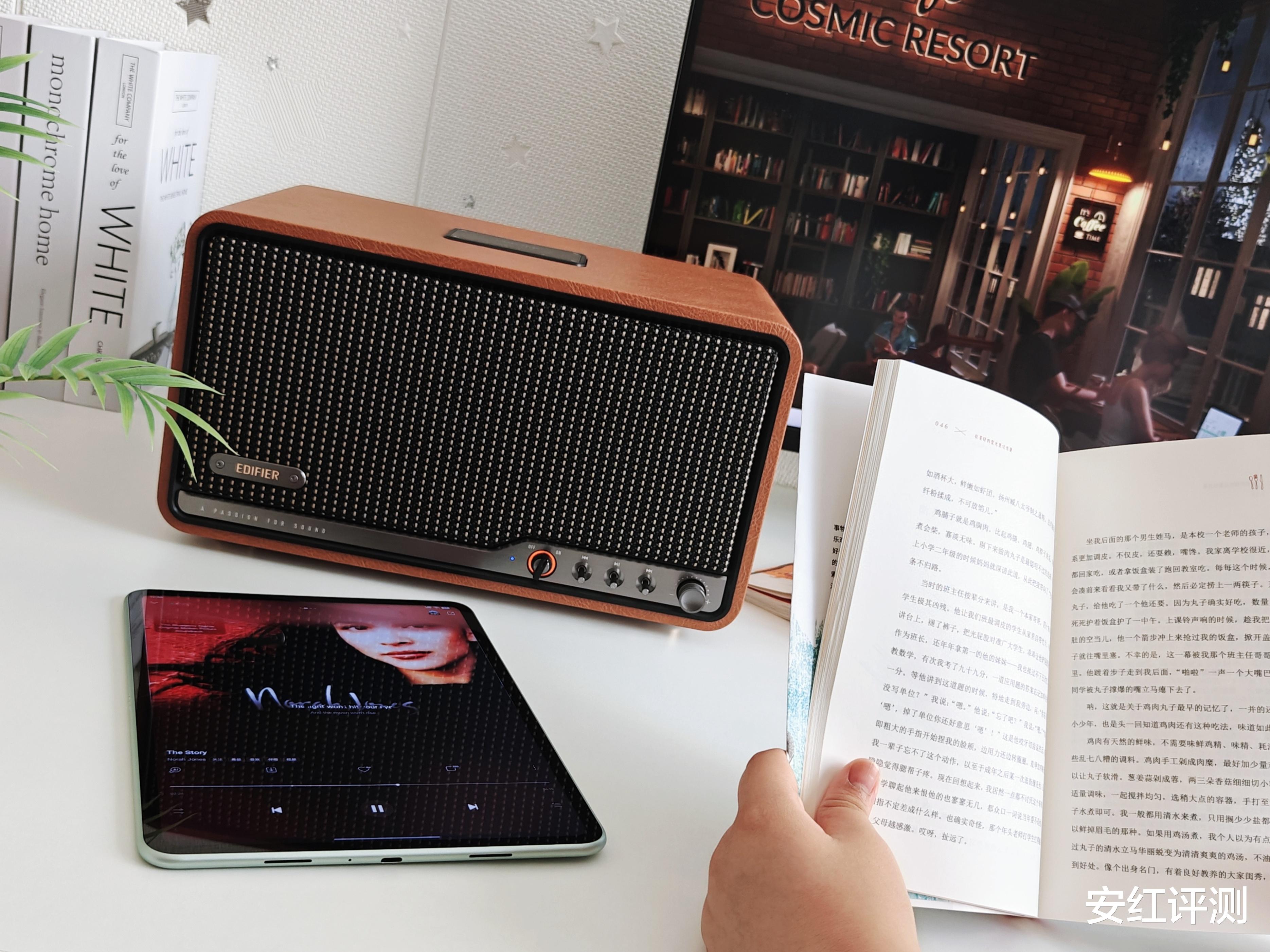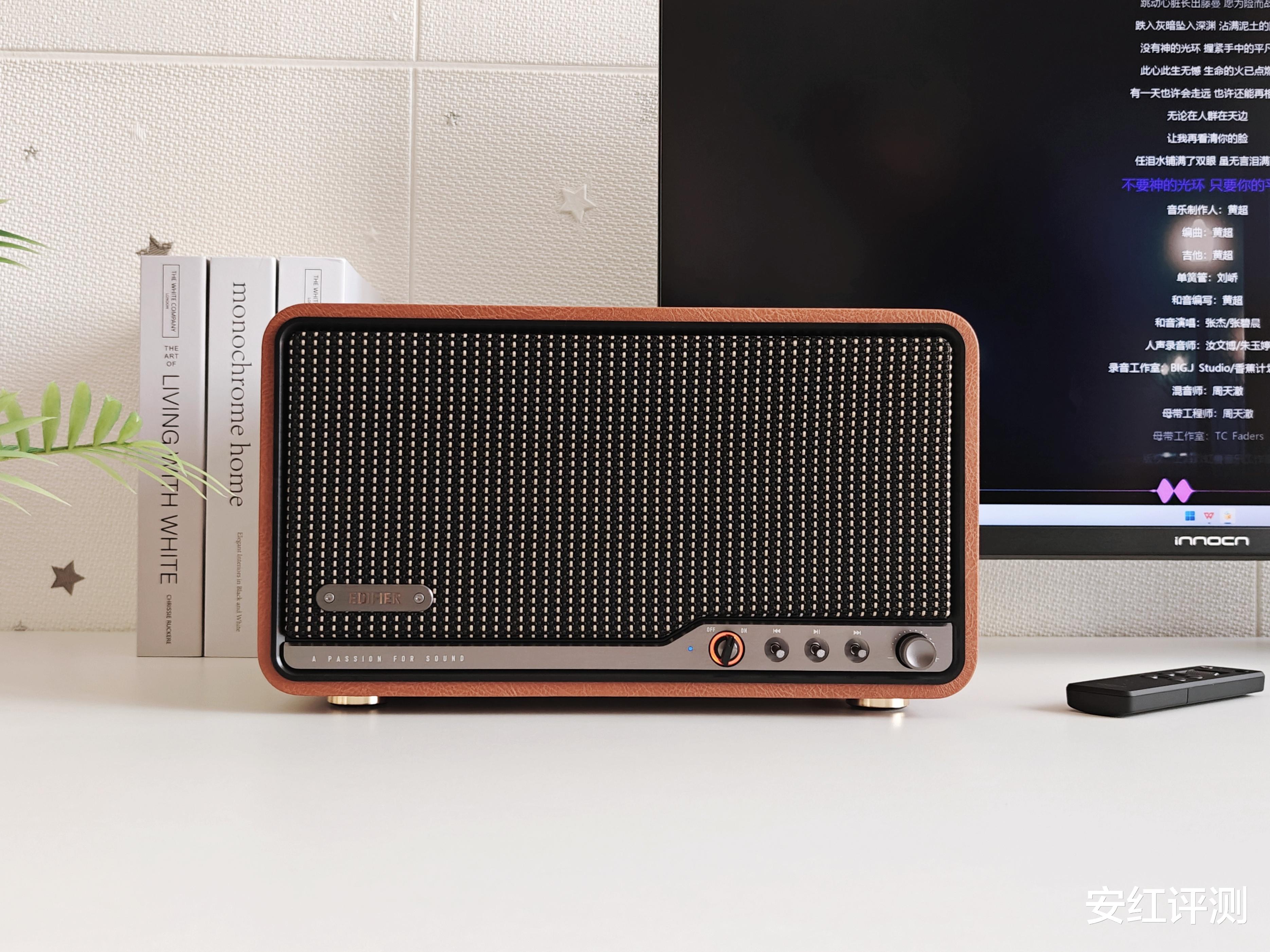 此款音箱有黑胡桃、暖棕咖和贝母白三种配色可选,黑胡桃沉稳尊贵,暖棕咖温馨惬意,贝母白优雅迷人。虽然每种配色都很NICE,但我更喜欢暖棕咖。音箱外形尺寸为350×229X203mm,比我之前使用的漫步者M330大上一圈,可以装进更大的发声单元。它采用MDF木质箱体外壳,外覆皮革纹理更显轻奢;双色编织网布,富有复古风情,同时具有高透声率,还能够防止灰尘等侵蚀音箱内部元件;铝质操控面板,表面经CNC工艺处理,辅以金属旋钮与拨杆,质感非凡。如此高级的复古设计尽显典雅,散发至臻气质,完美融入各种家居风格。