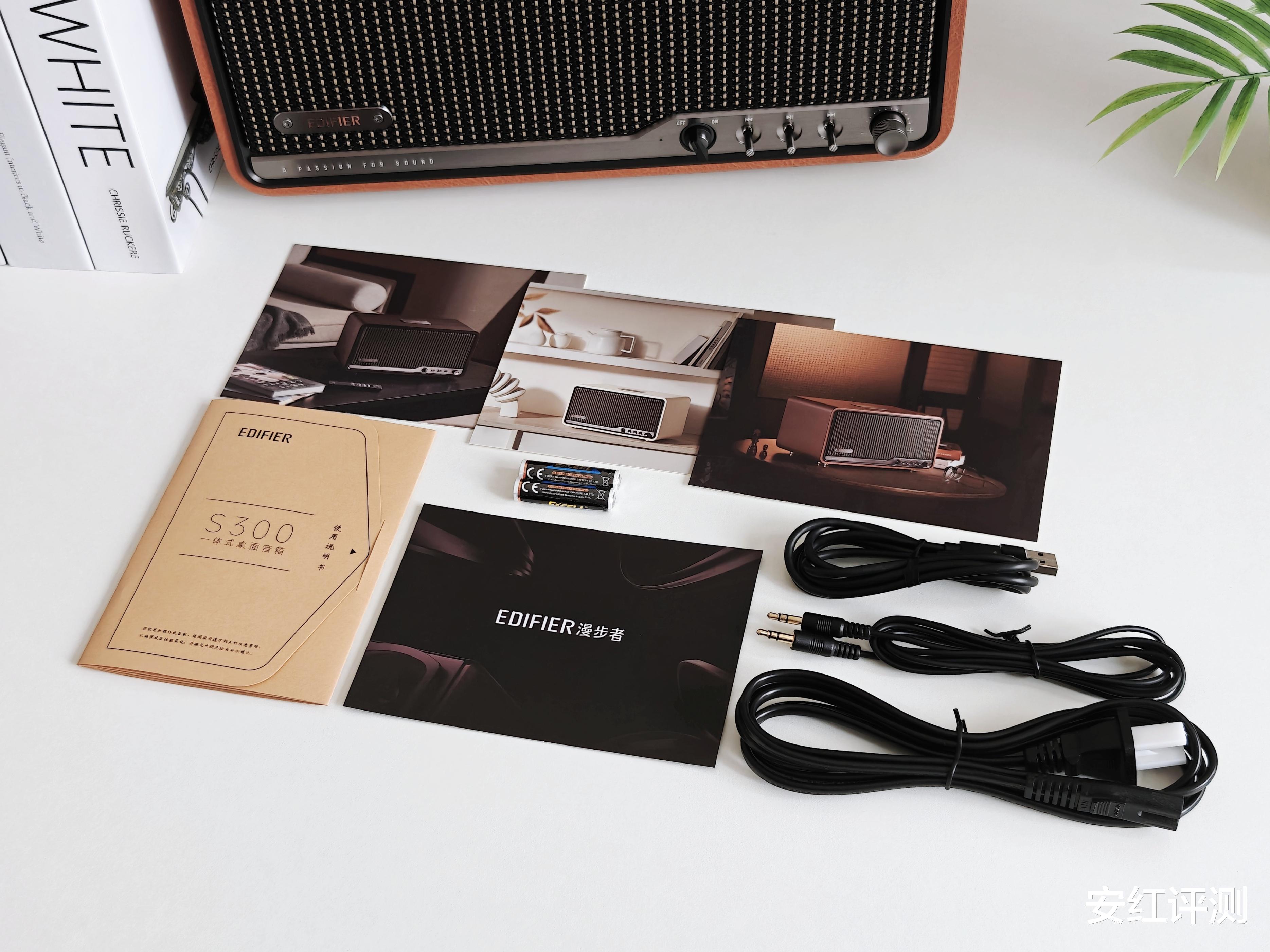 来看下此款音箱物料清单,除了音箱主体,还有电源线、音频线、Type-C数据线、USB转接头、遥控器、7号电池和使用说明书以及心意卡,配件丰富,带来一种超值感。