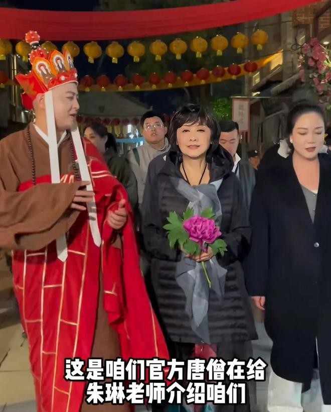 另外,洛邑古城的工作人员也是会玩,为了重现当年的经典画面,专门找了cos唐僧的演员,为朱琳送上了鲜花迎接。