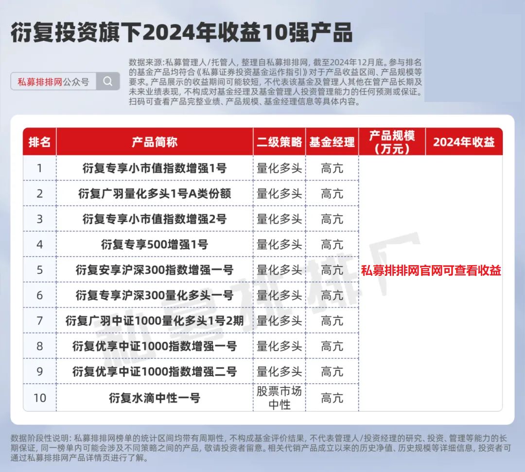 收益位居第1的是“衍复专享小市值指数增强1号”,2024年收益达***%,产品规模也为榜单最大,达***亿元。