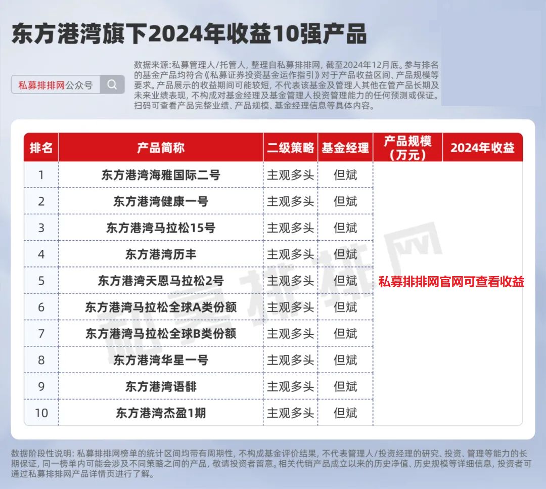 综上所述,公司人气位居前20且旗下产品2024年收益均值位居前10的私募公司共5家,分别为东方港湾、宁水资本、日斗投资、明汯投资、衍复投资。为了给大家提供更全面的信息,笔者接下来将分别盘点这5家私募旗下2024年收益10强的产品!