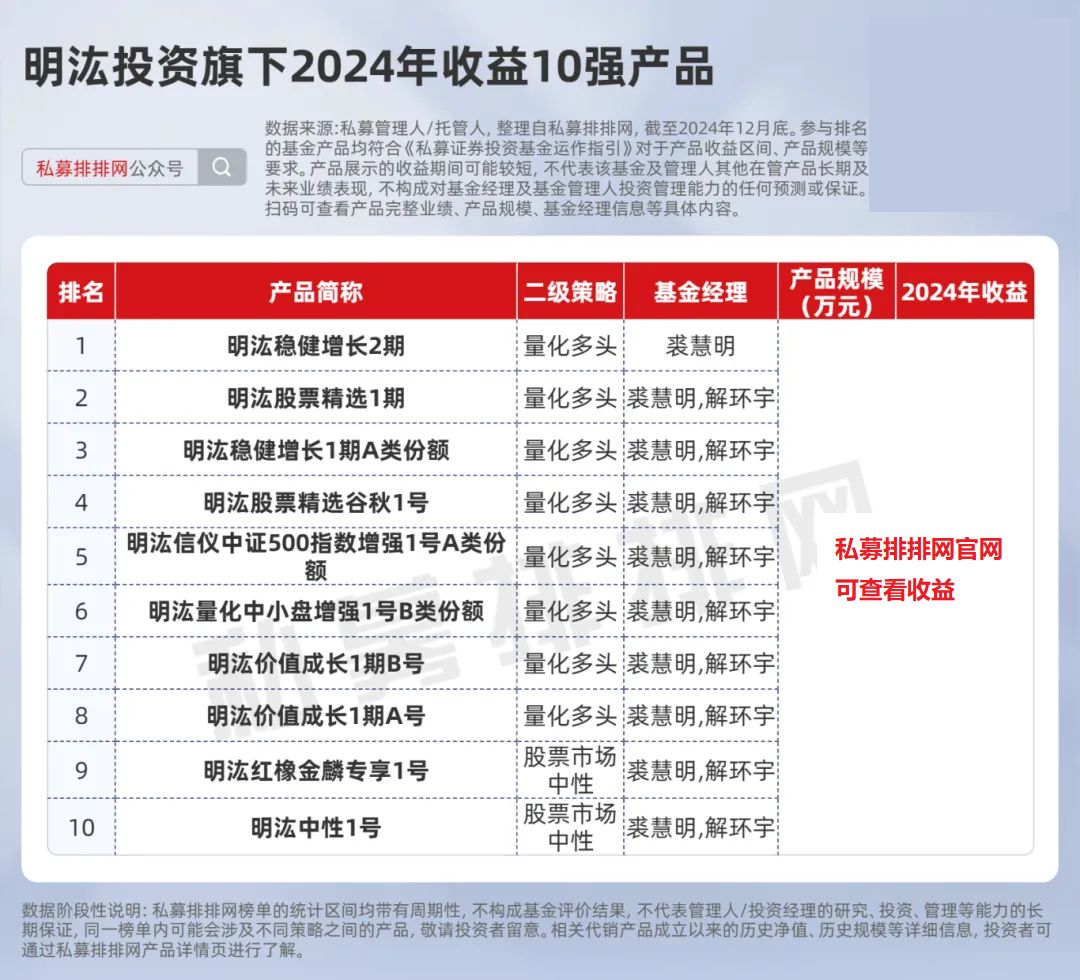 收益位居第1的是裘慧明管理的“明汯稳健增长2期”,2024年收益达***%,产品规模为***亿元。产品规模最大的是“明汯信仪中证500指数增强1号A类份额”,规模达***亿元,2024年收益达***%,由裘慧明和解环宇共同管理。