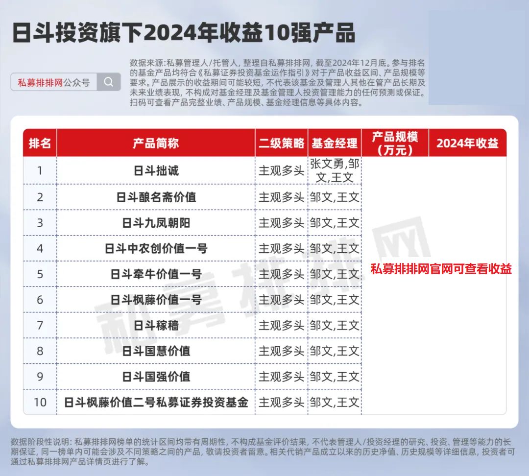 在10强产品中,张文勇、邹文、王文共同管理的“日斗拙诚”位居第1,2024年收益为***%,产品规模达***亿元。规模最大的产品为“日斗枫藤价值一号”,2024年收益达***%,产品规模为***亿元。