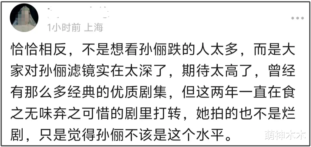 因为《甄嬛传》,因为孙俪年轻时候出演的一个接一个好剧,外界对她一直有着很高的期待,从2021年开始,孙俪减少了作品输出,沉寂多年之后终于回归拍戏,大家都等着她上演现实版“熹妃回宫”,结果从《乌云之上》到《蛮好的人生》,两部新剧都颇有种鸡肋感,正如网友所说,食之无味弃之可惜,“娘娘”没有拍烂剧,但总觉得她不该是这个水平。