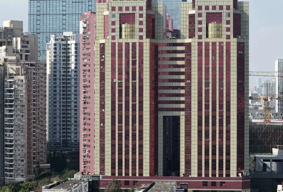 这座建筑落成于1997年,被认为是中式后现代主义的代表之一。其外观采用简洁的几何构图与对称设计,除了大面积的红色玻璃,其余部分以淡金色点缀,整体结构实际上相当规整。