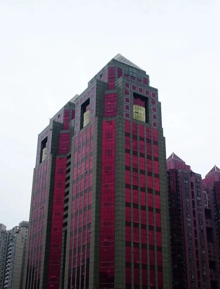 它矗立于现代风格环绕的CBD中,通体覆盖着暗红色的玻璃幕墙,在日光下泛着深沉而浓郁的光泽,与周围素雅的色调形成鲜明反差。