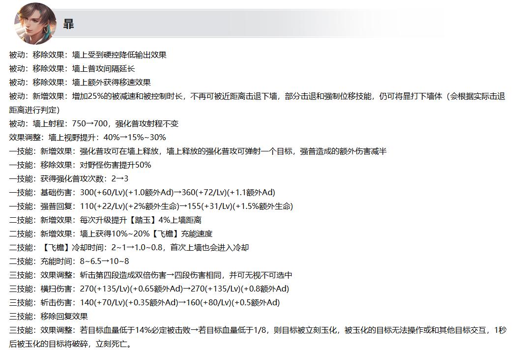 暃变异:被动改为只能被击退距离远的技能打下来,1技能的强普可在墙上释放,2技能新增升级可以增加上墙距离,大招第四段无视不可选中,1/3技能的伤害增加,大招的斩杀线改为八分之一的血量,该血量被大招命中则必死。