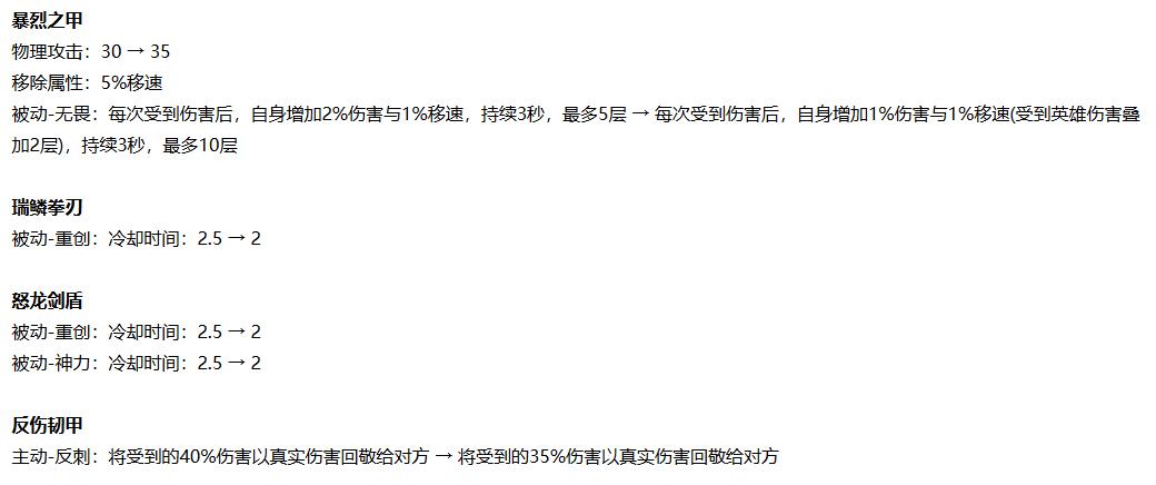 暴烈之甲削弱:物攻增加5点,5%移速转移至被动中,叠满十层被动触发。