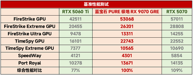 3DMark基准性能部分,可以看到光栅部分RX 9070 GRE相对RTX 5060 Ti 16GB的优势从25%~43%不等,只有SpeedWay这样的重负载光追测试项目中优势相对小一些,综合全部项目来看,RTX 5060 Ti 16GB的性能大约是RX 9070 GRE的77%,也就是说RX 9070 GRE综合性能领先RTX 5060 Ti 16GB大约31%。如果和RTX 5070相比的话,RX 9070 GRE也只是略低一点,其中TimeSpy得分甚至还有小幅反超,综合对比下来RTX 5070大约比RX 9070 GRE强9%。当然,这只是理论性能,接下来我们看看实战。