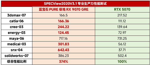 对于有专业设计需求的用户来讲,拥有12GB显存的RX 9070 GRE也是个性价比很高的选择。同时,AMD的消费级显卡也开放了大量专业显卡才有的功能,在对应的专业3D设计软件中能够提供远超消费级显卡的性能。而NVIDIA的消费级显卡则没有开放这些功能,目的就是防止冲击自家专业显卡的市场。从SPECView2020V3.1的测试结果也可以看到,由于RX 9070 GRE开放了一些专业显卡才支持的功能,它在不少渲染项目中相对RTX 5070都有巨大的优势,综合下来领先的幅度高达274%。如此一来,如果玩家有相应的3D专业设计需求,那么选择RX 9070 GRE无疑是性价比极高的方案。