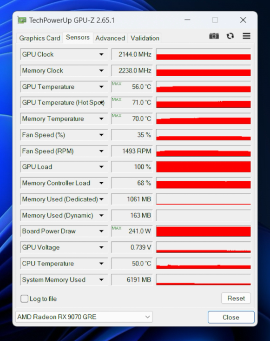 室温29℃,在默认240W整板功率下考机,蓝宝石PURE极地RX 9070 GRE的GPU温度最高56℃,显存温度最高70℃,风扇转速仅为35%,可见显卡的三风扇散热系统散热效果还是相当不错的,在散热和静音之间寻得了最佳平衡,也为玩家挖掘显卡超频潜力提供了足够的发挥空间。