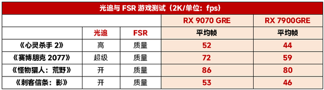 RDNA4架构对光线加速单元和AI加速单元都进行了升级,那么在光追游戏中,RX 9070 GRE的表现如何呢?我们拿它与上代RX 7900 GRE进行了对比,测试游戏统一开启FSR质量模式。可以看到,在同样的光追与FSR设置下,RX 9070 GRE相对RX 7900 GRE的性能优势从8%~18%不等,综合领先幅度大约为16%。可见新一代的光线加速单元确实在效率方面有了明显的提升。此外,我们也可以看到,在FSR的加持下,RX 9070 GRE也完全不惧光追游戏的高要求,可以提供流畅的游戏体验。考虑到RDNA 4显卡还独享即将实装的FSR4,在未来AI加持的FSR4超分辨率与多帧生成助力下,RX 9070 GRE的升级价值就显得更高了。