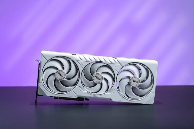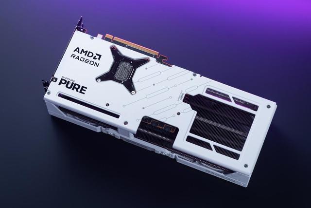 再来看看具体的产品,蓝宝石PURE极地RX 9070 GRE采用了该系列的全新外观设计,极地白配色特别适合喜欢纯白主机的玩家,一体式框架设计的卡身上采用文字、线条与LOGO点缀,进一步增强了显卡的科幻感。