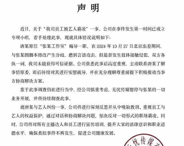 在事情发酵的26日凌晨,无忧传媒发声明,宣布暂停与张大大的一切业务,并决定彻查此事。
