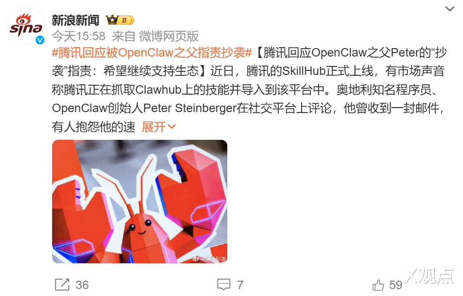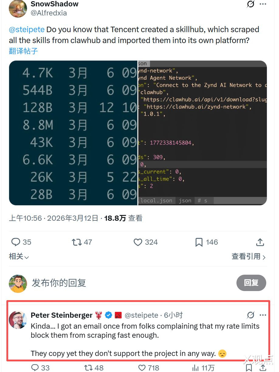 而Peter直接将矛头指向了腾讯刚刚上线的SkillHub平台。在他看来,腾讯的行为就是典型的“拿来主义”——利用开源项目的成果,却不给予任何形式的支持。