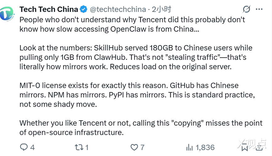 腾讯的意思再清楚不过:我们不仅没有加重你们的服务器负担,反而帮你们分担了180倍的流量压力。那87万次下载如果全部涌向ClawHub官方服务器,会给Peter带来多大的成本压力?