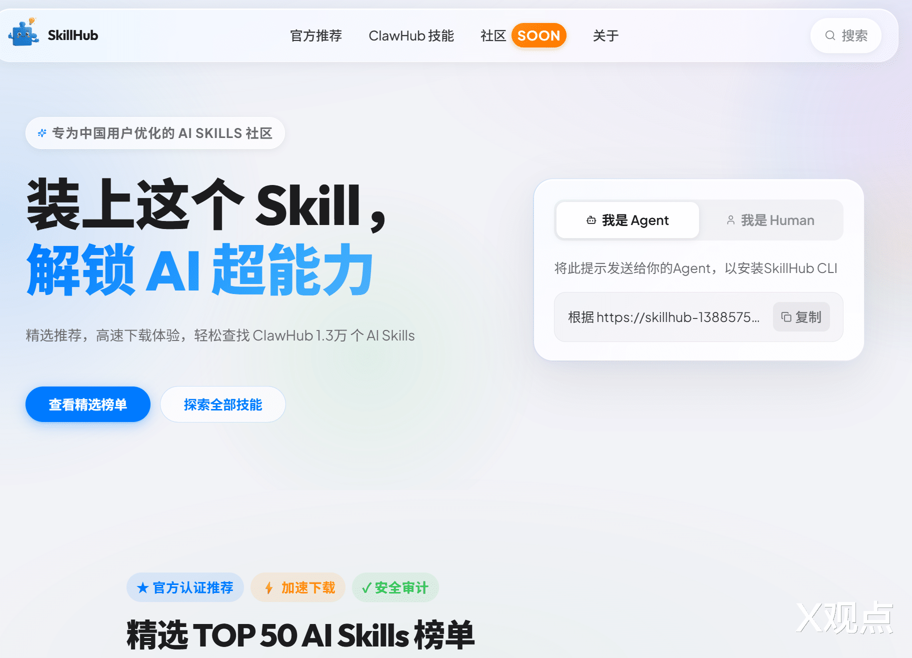 根据腾讯的介绍,SkillHub社区为中国用户提供国内加速镜像,聚合官方社区超过13000个Skills,对其进行全量的安全扫描排查,去除具有安全风险的恶意/侵权Skills;并从中精选出最适合中国用户的TOP 50优质Skills,提供官方认证、加速下载、安全审计三重全面保障。
