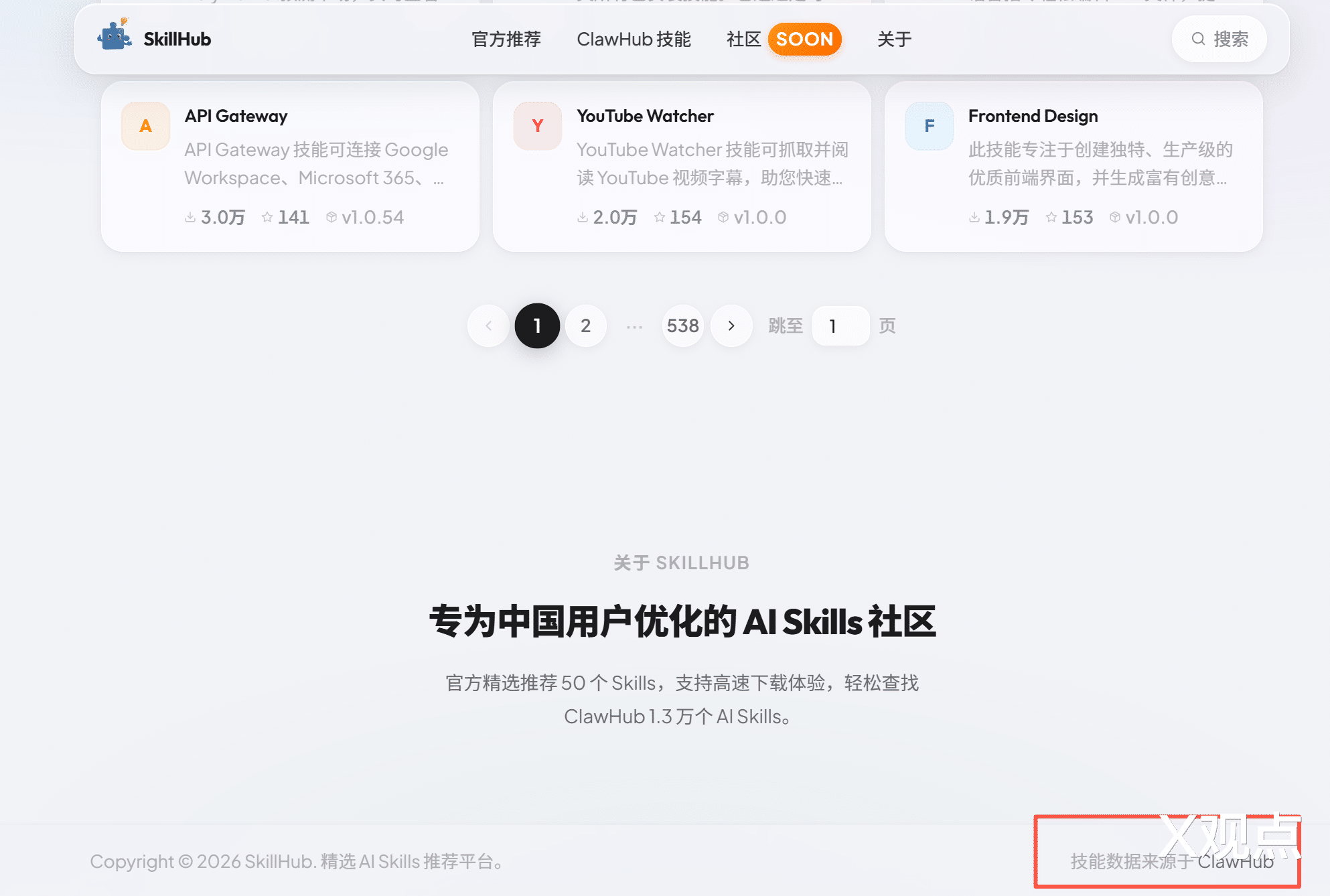 SkillHub官网右下角明确显示着:“技能数据来源于ClawHub”。这种署名行为,在开源协议允许的范围内,其实是符合规范的。