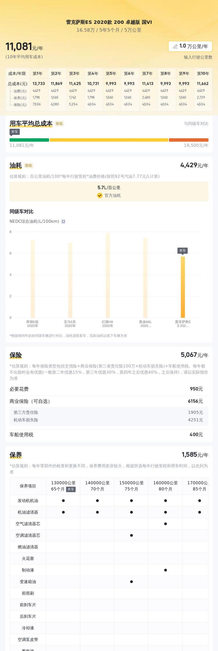 此外,你还需要考虑后期的用车成本。虽然ES200的燃油经济性不错,但它的保养费用相对较高。根据估算,ES200的年均用车成本大约在11354元左右,这其中包括了燃油费、保养费、保险费等各项支出。