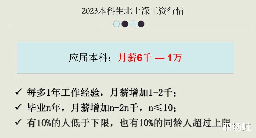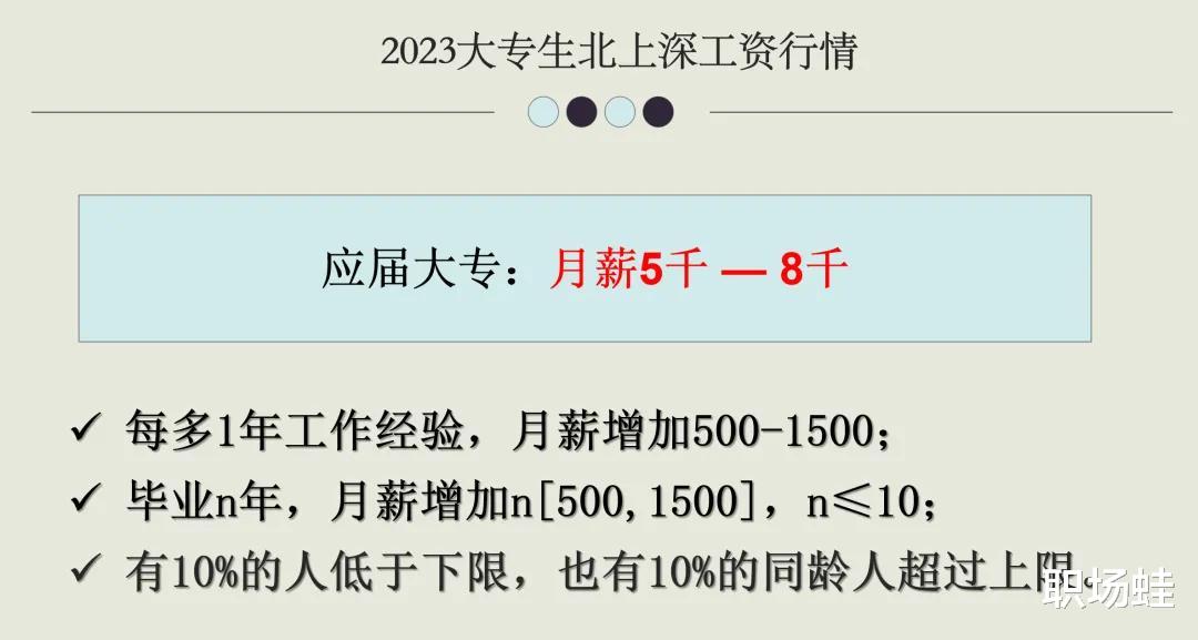 比如大专毕业10年,在上海的工资行情大致这样算:在应届学弟学妹5-8K的基础上,增加10倍的【500,1500】即5-15K的经验年限加成,结果为【10K,23K】,大致80%的同龄人在这个区间,有10%低于下限月薪1万,也有10%算顶级的,超过了月薪2万3。月薪区间【10K,23K】,按照平均水平的一年发放14薪来算,年薪区间就是【14w,32w】。