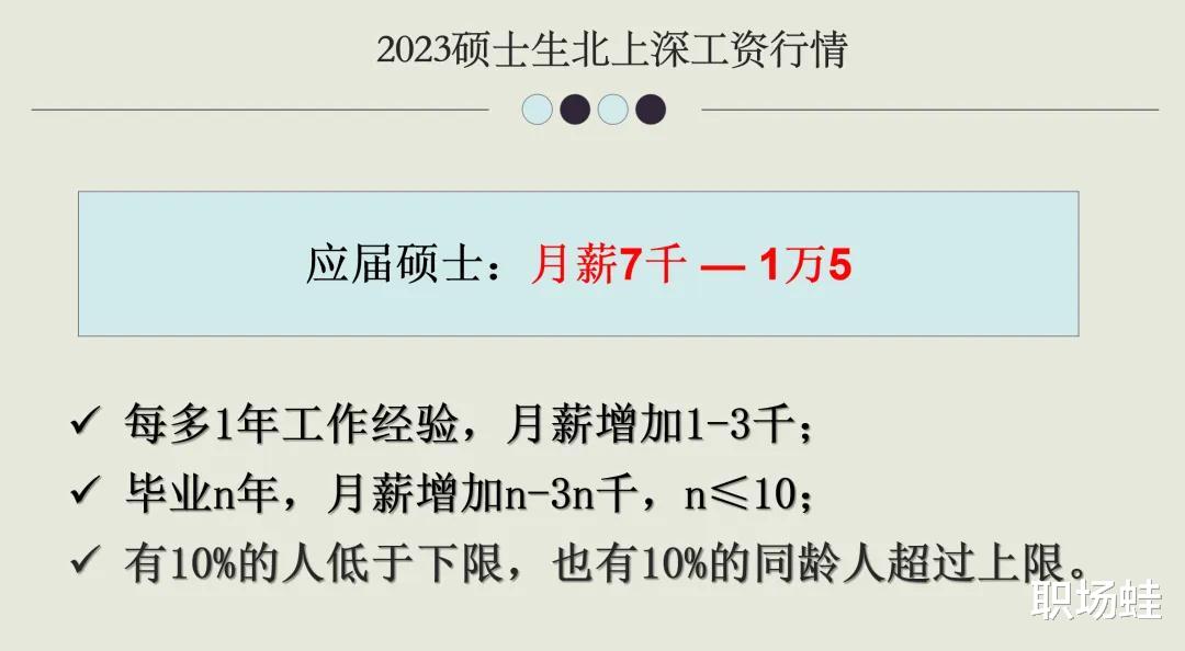 再看硕士生,硕士大多是25周岁毕业,虚岁26,我们这次按照毕业5年来看,硕士应届生的月薪基数是7-15K,5年则增加5-15K,所以同龄人工资行情为【12K,30K】,高于3万算高工资,低于12K算低薪。折算成年薪区间【17w,42w】,中间值为29.5万≈年薪30万。