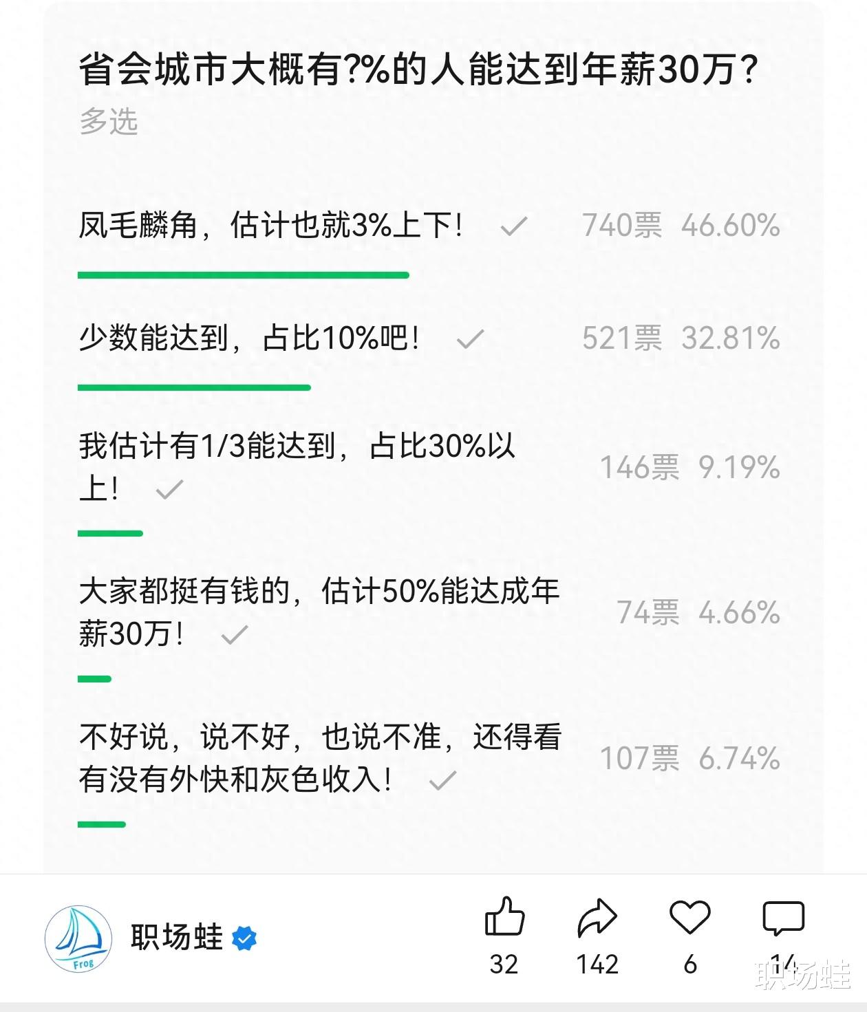 省会的经济水平,当然比四大一线城市稍微低一点,但就收入水平来说显然是比附近尤其本省大多数兄弟城市要来得高一点。废话不多说,你就根据你的体感来做个选择,你说:在省城,大概有百分之几的人能达到年薪30万及以上?看下调查结果跟你的认知是否有偏差。