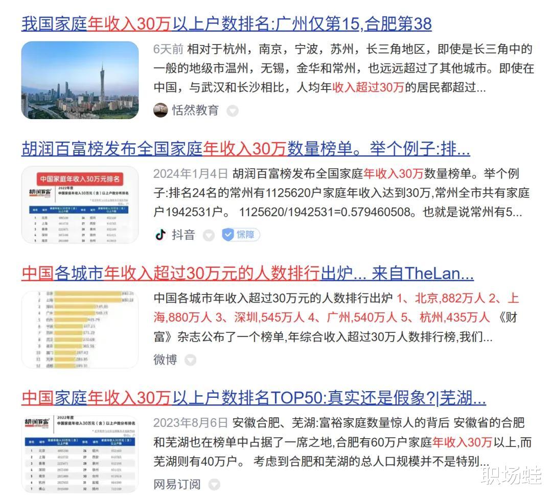 说来奇怪,其他类似的榜单,从2021年之后就都多了2个字“家庭”,变成了“家庭年收入30万”这样的排行榜,见下图。我们还要去查询并计算各地区的家庭规模、人数,再去相除得人均收入,那数据准确性和参考性就大打折扣了。所以本篇不采纳。