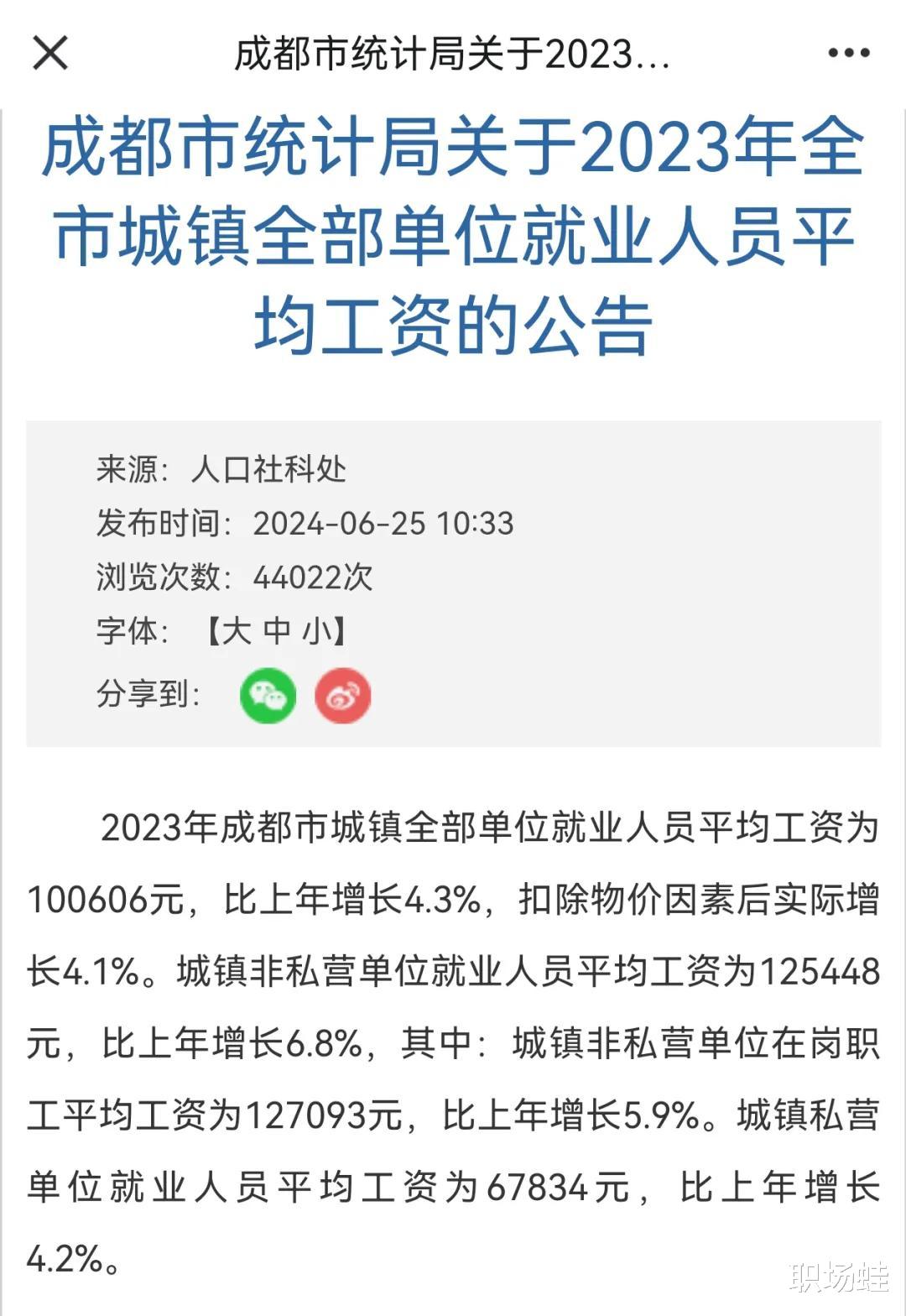 这里的年薪需要除以12个月,得成都的月税前工资为8383元。当然,你可以看到这是个平均值,因为有一部分人在非私营单位,其实主要就是体制内和大企业,他们的收入更高,约等于体制外私营单位人员收入的2倍。
