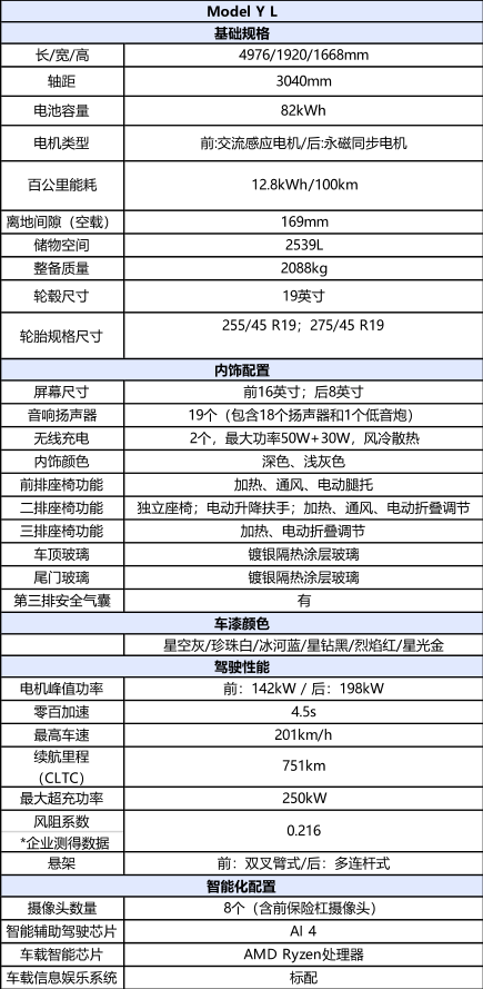 特斯拉不造慢车,Model Y L 具备双电机全轮驱动,百公里加速仅需 4.5s,配合 82kWh 的三元锂电池,可以实现最长 751km的续航里程。